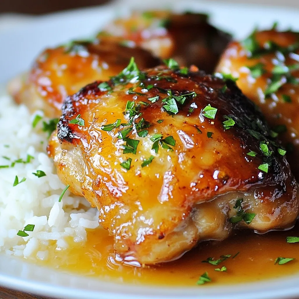 - 4 boneless, skinless chicken thighs - 1/4 cup honey - 1/4 cup unsalted butter - 3 cloves garlic, minced - 1 tablespoon soy sauce - 1 tablespoon apple cider vinegar - 1/2 teaspoon smoked paprika - 1/2 teaspoon black pepper - Salt to taste - Fresh parsley, chopped (for garnish) In this dish, the main ingredients are key to its flavor. The chicken thighs are juicy and tender. Honey gives a sweet touch, while butter adds richness. Garlic brings a savory note that makes everything better. The flavor enhancers round out the dish. Soy sauce adds depth, and apple cider vinegar gives a tangy kick. Smoked paprika adds warmth, and black pepper gives a bit of spice. Use salt wisely to bring out all the flavors. Finally, don’t forget the fresh parsley. It adds color and a fresh taste. This simple addition makes the dish look and taste great. With these easy-to-find ingredients, you can create a meal that feels special, yet is quick to make. {{ingredient_image_1}} - Melt 1/4 cup unsalted butter in a small saucepan over medium heat. - Add 3 cloves of minced garlic and sauté for about 1 minute until fragrant. - Stir in 1/4 cup honey, 1 tablespoon soy sauce, 1 tablespoon apple cider vinegar, 1/2 teaspoon smoked paprika, and 1/2 teaspoon black pepper. - Mix well and let it simmer for 2-3 minutes until the sauce thickens slightly. - Season both sides of 4 boneless, skinless chicken thighs with salt. - Heat a little oil in a large skillet over medium-high heat. - Add the chicken thighs to the skillet and cook for 5-7 minutes on each side. - Look for a golden brown color and ensure they are cooked through. - Pour the honey butter sauce over the chicken in the skillet. - Continue to cook for an additional 2-3 minutes. - Let the sauce caramelize and coat the chicken beautifully. - Remove the skillet from heat and let the chicken rest for a couple of minutes. - Garnish with freshly chopped parsley for a touch of color and flavor. - Use oils with high smoke points. Choices like canola or vegetable oil work best. - Always check that chicken is cooked through. Use a meat thermometer to ensure it reaches 165°F. Cooking chicken thighs can be tricky. They cook fast and can dry out. To avoid this, keep a close eye while they sear. Turn them only once for a perfect brown crust. - Want it sweeter? Add more honey. To spice it up, try a pinch of chili powder or red pepper flakes. - You can swap honey for maple syrup for a different taste. Use low-sodium soy sauce for a healthier option. Feel free to adjust the flavors. This sauce is flexible and can cater to your taste. - Serve the sticky honey butter chicken over fluffy rice. It absorbs the sauce well and adds texture. - For a colorful plate, add bright roasted vegetables on the side. Drizzle extra sauce over the chicken for a glossy finish. It makes the dish look even more appealing. Garnish with chopped parsley for a fresh touch. Pro Tips Marinating the Chicken: For enhanced flavor, marinate the chicken thighs in the honey butter mixture for at least 30 minutes before cooking. Adjusting Sweetness: If you prefer a less sweet dish, reduce the amount of honey by half and balance it with a dash more soy sauce. Using Fresh Herbs: Experiment with fresh herbs like thyme or rosemary in the sauce for an aromatic touch that complements the honey and garlic. Perfectly Cooked Chicken: To ensure the chicken is cooked through without drying out, use a meat thermometer; the internal temperature should reach 165°F (75°C). {{image_2}} You can switch up the protein in this recipe. Here are two tasty ideas: - Sticky Honey Butter Salmon: Use salmon fillets instead of chicken. Cook the salmon in the same way. The honey butter sauce goes great with the rich flavor of salmon. - Sticky Honey Butter Tofu: For a plant-based option, use firm tofu. Press the tofu to remove excess water. Cut it into cubes and follow the same cooking steps. If you have dietary needs, here are some easy swaps: - Gluten-free adaptations: Use tamari instead of soy sauce. It gives the same flavor without gluten. - Low-sugar alternatives: Replace honey with a sugar-free syrup. You can also use a smaller amount of honey to cut down on sugar. Want to change the taste? Here are two great ways: - Adding heat with chili powder: Mix in a teaspoon of chili powder to the sauce. This adds a nice kick that pairs well with the sweet honey. - Incorporating citrus flavors: Squeeze in some fresh lemon or lime juice. This adds a bright flavor that balances the sweetness of the honey. To store leftovers, let your sticky honey butter chicken cool first. Place it in an airtight container. This keeps the chicken fresh and tasty. In the fridge, it lasts up to four days. Always check for signs of spoilage before eating. You can freeze sticky honey butter chicken too. First, let it cool down completely. Then, wrap it tightly in plastic wrap. Place it in a freezer-safe bag or container. It can last in the freezer for up to three months. When you want to eat it, thaw it in the fridge overnight. Reheat it in a skillet over low heat. Stir occasionally until hot. Leftover chicken is super versatile! Chop it up and add it to salads for a tasty lunch. You can also use it in wraps, adding some veggies and sauce. It’s a quick way to make a delicious meal. Don’t forget to drizzle extra honey butter sauce on top for extra flavor! You can serve sticky honey butter chicken with many tasty sides. Here are some ideas: - Fluffy rice, which soaks up the sauce well. - Roasted vegetables, like carrots, broccoli, or green beans. - A fresh salad with greens, tomatoes, and a light dressing. - Mashed potatoes for a creamy, comforting touch. - Soft dinner rolls to mop up the sauce. Yes, you can make this recipe in advance. Cook the chicken and sauce, then cool it down. Store it in the fridge for up to three days. You can reheat it on the stove or in the microwave. Just ensure it's heated through before serving. To add some heat, you can try these tips: 