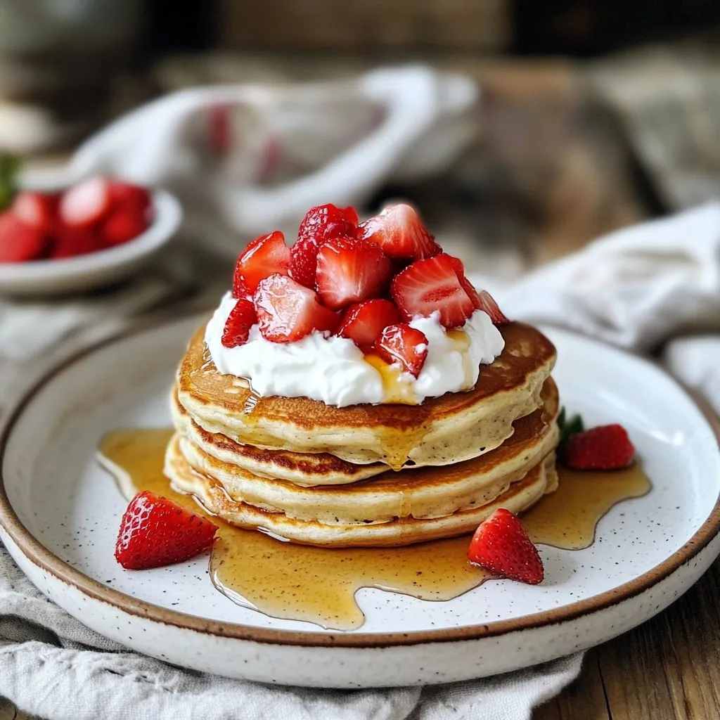 Heat a non-stick skillet over medium heat. Lightly grease it with cooking spray or butter. Pour about 1/4 cup of batter for each pancake. Cook for 2-3 minutes, until bubbles form on top. Then, flip the pancakes and cook for another 1-2 minutes. They should be golden brown. Serve them stacked high with Greek yogurt or whipped cream and fresh strawberries on top.