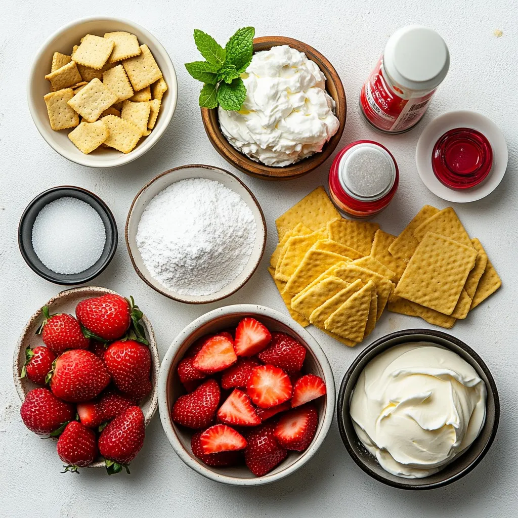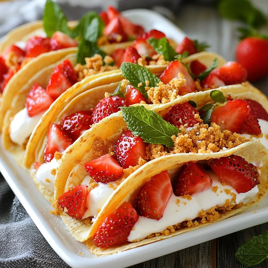 - Fresh strawberries: Use 1 cup of diced strawberries. Rinse and chop them into small pieces. This gives a bright, fresh taste. - Dairy components: You need 1 package (8 oz) of softened cream cheese. Also, use 3/4 cup of whipped cream to add fluffiness. - Crust elements: Get 1 cup of crushed graham crackers. Combine this with 1/4 cup of melted butter. This creates a crunchy topping. - Taco shell options: Choose 8 small taco shell snacks or mini flour tortillas. You can toast the tortillas until crisp for a homemade touch. - Optional garnishes: For a finishing touch, use fresh mint leaves. They add color and a nice aroma. These ingredients work together to create a delightful treat. Each component plays a role in the taste and texture. With fresh strawberries and rich cream, your tacos will shine. Enjoy the process of making them! {{ingredient_image_1}} To make the strawberry filling, start with fresh strawberries. Dice one cup of strawberries and place them in a medium bowl. Add one tablespoon of sugar and one teaspoon of lemon juice. Toss the strawberries well, then let them sit for about 10 minutes. This is called macerating. It helps the strawberries release their juices and become sweeter. The balance of sweetness is key. You want the strawberries to taste fresh, not too sweet. Next, let’s make the cheesecake filling. In a separate bowl, beat eight ounces of softened cream cheese until it is smooth. Gradually add one-fourth cup of powdered sugar and half a teaspoon of vanilla extract. Mix until creamy and well combined. Now, fold in three-quarters of a cup of whipped cream gently. This method keeps the filling light and fluffy. For the crunch topping, take one cup of crushed graham crackers and place them in a small bowl. Pour in one-fourth cup of melted butter. Mix them together until you get a crumbly texture. This adds a nice crunch to each bite of your tacos. It’s time to assemble the tacos! Take a taco shell and add about two tablespoons of the cheesecake filling into it. Next, add a tablespoon of the macerated strawberries on top. Finally, sprinkle the graham cracker crunch topping over everything. This layering gives each taco a burst of flavor. After filling all the taco shells, place them in the refrigerator. Chill the tacos for at least 15 minutes. This step is important because it helps the filling firm up a bit. Enjoy these delightful tacos when they are ready! To keep your strawberry crunch cheesecake tacos fresh, store them in an airtight container. This helps keep the shells crisp. If you have leftovers, eat them within two days for the best taste. For parties, these tacos shine! Arrange them on a large platter. You can drizzle some strawberry juice around them for flair. Serve with extra whipped cream on the side for guests to add as they like. Want to mix it up? You can add chocolate! Just melt some chocolate and drizzle it over the tacos. This gives a rich twist. You can also swap strawberries for other fruits. Try blueberries, raspberries, or even peaches. Each fruit brings a new flavor, making your tacos exciting every time! Plating is key for an eye-catching dish. Place the tacos in a row on a bright, colorful platter. This makes them pop! For garnishing, fresh mint leaves add a lovely green touch. You can also sprinkle a bit of crushed graham crackers on top for crunch. A little creativity can make a big difference in how your tacos look! Pro Tips Perfectly Macerated Strawberries: Allow the strawberries to sit in sugar and lemon juice for at least 10 minutes to enhance their natural sweetness and flavor. Chill for a Better Texture: After assembling the tacos, refrigerate them for at least 15 minutes. This helps the cheesecake filling firm up, making them easier to eat. Customize Your Crunch: Feel free to add crushed nuts or chocolate to your graham cracker topping for an extra layer of flavor and texture. Presentation Matters: Arrange the tacos on a colorful platter and garnish with fresh mint leaves for an appealing presentation that will impress your guests. {{image_2}} You can make these tacos gluten-free. Use gluten-free graham crackers to keep the crunch. For taco shells, try corn tortillas or gluten-free wraps. They will hold the filling well and taste great. Always check labels to confirm they are gluten-free. Vegan options are easy to incorporate. Use vegan cream cheese for the filling. It works just as well and tastes amazing. Choose a plant-based whipped topping to keep it light and fluffy. This way, everyone can enjoy these tasty tacos. To add more flavor, consider spices or extracts. A pinch of cinnamon in the cheesecake filling adds warmth. You can also try almond extract for a nutty twist. These small changes can take your tacos to a new level. Store your tacos in the fridge carefully. If you keep them assembled, the shells may get soggy. I recommend storing the filling and shells separately. This way, the shells stay crunchy. Wrap the taco shells in foil or a sealed bag. Place the cheesecake and strawberry filling in a container with a lid. These amazing tacos last about two days in the refrigerator. After that, the shells may lose their crispness. If you want to freeze them, do not assemble the tacos. Store the filling and shells in separate containers. When you want to enjoy them, thaw the filling overnight in the fridge. Then, assemble and serve them fresh! Yes, you can use frozen strawberries. However, they can change the texture. Frozen berries tend to be softer when thawed. You may also need to adjust the sugar. Frozen strawberries can be less sweet, so taste before adding more sugar. To keep your taco shells crispy, make sure they are dry. Use fresh taco shells or mini tortillas. Toast them in the oven to get them extra crunchy. Assemble the tacos just before serving. This keeps the shells from getting soggy. Yes, you can meal prep these tacos. Prepare the fillings and toppings ahead of time. Store them in separate containers. Assemble 
