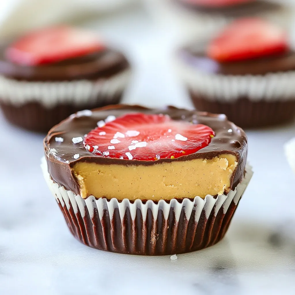 To make Strawberry Peanut Butter Cups, you need these simple ingredients: - 1 cup smooth peanut butter - 1 cup fresh strawberries, pureed - 1 cup dark chocolate chips - 2 tablespoons coconut oil - 1 tablespoon honey or maple syrup (optional, for sweetness) - Sea salt, for garnish These ingredients blend well to create a delicious treat. The peanut butter pairs perfectly with fresh strawberries. The dark chocolate gives a rich flavor that ties it all together. You can add sweeteners if you like your treats a bit sweeter. Honey or maple syrup works great. Just one tablespoon gives a nice touch. If you want to keep it simple, you can skip sweeteners. The natural sweetness from strawberries adds flavor. You will need a few kitchen tools to make this recipe: - Muffin tin - Cupcake liners - Medium bowls - Microwave or double boiler - Spoon or spatula - Toothpick (for swirling) Using these tools makes the process easier and cleaner. The muffin tin helps shape the cups, while the liners let you remove them easily. {{ingredient_image_1}} Start by lining a muffin tin with cupcake liners. This step helps you remove the cups easily later. Next, mix 1 cup of smooth peanut butter with honey if you want extra sweetness. Stir until the mix is smooth and creamy. In another bowl, combine 1 cup of dark chocolate chips with 2 tablespoons of coconut oil. Melt them together. You can use a microwave or a double boiler. If using a microwave, heat in 30-second bursts, stirring in between. Once melted, the chocolate should be smooth and shiny. When melting chocolate, be careful not to overheat it. Too much heat can cause the chocolate to seize and clump. Stir often to keep the heat even. If you're using a double boiler, ensure that the water does not touch the chocolate bowl. This way, you heat gently. If your chocolate starts to clump, add a bit more coconut oil to help it smooth out. Now, let's build our cups! Spoon about 1 tablespoon of melted chocolate into each cupcake liner. Spread it evenly to cover the bottom. Freeze the tin for 10 minutes until the chocolate hardens. Then, add 1-2 tablespoons of the peanut butter mix on top. Press it down gently to flatten. Next, drizzle around 1 tablespoon of strawberry puree over the peanut butter. Use a toothpick or spoon to swirl it in. Finally, cover everything with another layer of melted chocolate. Make sure the tops are smooth. Sprinkle a pinch of sea salt on top for extra flavor. Freeze for 30-40 minutes until set, then enjoy your delicious treats! To make your Strawberry Peanut Butter Cups smooth, use creamy peanut butter. It blends well and creates a nice bite. When mixing, stir the peanut butter and honey until they are well combined. This ensures a silky texture. You can also warm the peanut butter slightly to help it mix better. Chocolate can seize if it gets too hot or meets moisture. To avoid this, melt the chocolate slowly. Use a microwave in short bursts or a double boiler. Make sure your bowls and utensils are dry. If your chocolate does seize, add a small amount of coconut oil and stir until it becomes smooth again. Store your Strawberry Peanut Butter Cups in an airtight container. Keep them in the fridge for best results. If you want to save them longer, you can freeze them. Just make sure to separate layers with parchment paper. They will stay fresh for a few weeks in the fridge or up to three months in the freezer. Pro Tips Use Quality Chocolate: Opt for high-quality dark chocolate chips for a richer flavor. The better the chocolate, the more indulgent your peanut butter cups will taste. Chill Between Layers: Ensure each layer is set in the freezer before adding the next. This helps maintain distinct layers and prevents the flavors from bleeding together. Experiment with Sweetness: Adjust the sweetness of the peanut butter mixture by adding more or less honey or maple syrup based on your preference. Taste as you go! Storage Tips: Store the cups in an airtight container in the refrigerator for up to two weeks. They can also be frozen for longer storage, just let them thaw slightly before enjoying. {{image_2}} If you want a nut-free option, use sun butter or soy nut butter. These spreads taste great and work well in this recipe. They give you the same creamy texture without nuts. Just swap the peanut butter with your chosen nut-free spread. You will still enjoy a tasty treat! You can change the fruit if you like! Try using raspberries or blueberries instead of strawberries. Just puree the fruit like you would with strawberries. Each fruit brings its own flavor. This lets you create a new taste each time you make the cups! Want to make your cups a bit healthier? Use dark chocolate chips with a higher cocoa content. This gives you richer flavor with less sugar. You can also skip the honey or maple syrup and let the fruit's natural sweetness shine through. Another option is to use Greek yogurt instead of peanut butter for a different twist. These swaps keep the fun without all the extra sugar! Store your strawberry peanut butter cups in an airtight container. This keeps them fresh. You can place them in the fridge for up to a week. If you prefer a cold snack, they are great chilled. Just make sure to keep them covered. To freeze your cups, first let them set completely. Then, place them in a single layer in a freezer-safe container. You can also wrap each cup in plastic wrap for extra protection. These cups will stay fresh in the freezer for up to three months. When you want one, just take it out and let it thaw in the fridge. These treats can last about a week in the fridge. Check for signs of spoilage before eating. If they smell off or have a strange texture, it’s best to toss them. Look for any mold or changes in color. If you see any of these signs, do not eat them. Always trust your senses when it comes to food safety. Yes, you can use crunchy peanut butter. It adds a fun texture to your cups. The chunks of peanuts give each bite extra crunch. I