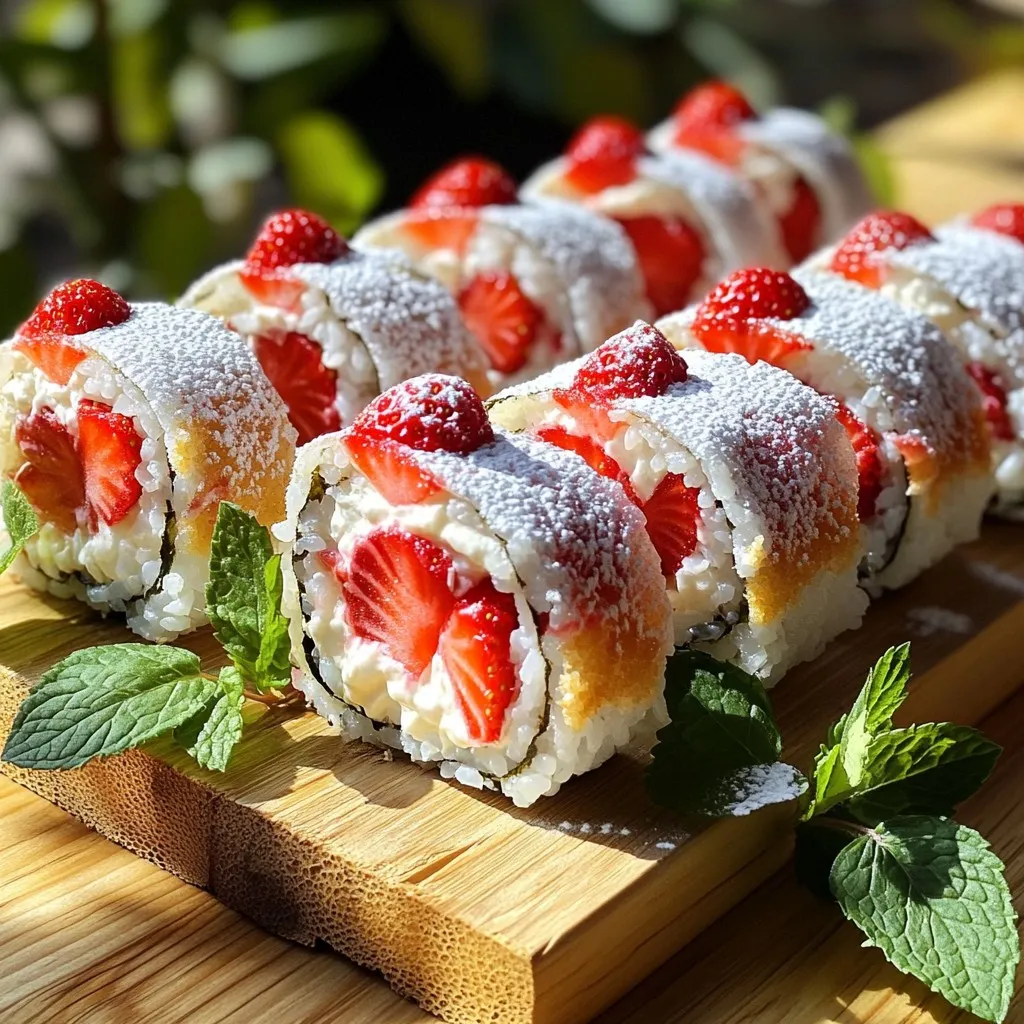 To make strawberry shortcake sushi rolls, you will need the following ingredients: - 1 cup sushi rice - 1 ¼ cups water - 2 tablespoons granulated sugar - 1 tablespoon rice vinegar - 1 teaspoon pure vanilla extract - 6 large strawberries, hulled and quartered - 1 cup whipped cream (store-bought or homemade) - 4 sheets of nori (seaweed) - 1 tablespoon powdered sugar (optional, for dusting) - Fresh mint leaves (for garnish) When picking strawberries, look for bright red color. They should feel firm to the touch. Avoid any that are soft, bruised, or have dark spots. Smell the strawberries; they should have a sweet scent. If you can, buy organic strawberries. They often taste better and have fewer chemicals. If you can't find sushi rice, you can use short-grain rice. It has a similar sticky texture. For those who prefer a lighter option, you can swap whipped cream for Greek yogurt. If you're avoiding gluten, ensure your nori is gluten-free. You can also replace strawberries with other fruits, like bananas or peaches, for a fun twist. To start, rinse 1 cup of sushi rice under cold water. Keep rinsing until the water runs clear. This step helps remove extra starch. Next, combine the rinsed rice with 1 ¼ cups of water in a saucepan. Turn the heat to medium-high and bring it to a boil. Once it boils, cover the pot with a lid and lower the heat. Let it simmer for about 20 minutes. The rice will absorb all the water and become tender. After cooking, let it sit covered for an extra 10 minutes. This steaming helps the rice become fluffy. While the rice steams, mix 2 tablespoons of granulated sugar, 1 tablespoon of rice vinegar, and 1 teaspoon of pure vanilla extract in a small bowl. Stir until the sugar dissolves completely. When the rice is ready, transfer it to a large bowl. Gently fold in the sugar mixture with a spatula. Be careful not to mash the rice; you want it to stay fluffy. Allow the seasoned rice to cool down to room temperature. Now, grab a bamboo sushi mat and place it on a flat surface. Lay one sheet of nori, shiny side down, on the mat. Wet your hands to prevent the rice from sticking. Take about ½ cup of sushi rice and spread it evenly over the nori. Leave a 1-inch border at the top. Next, place a line of quartered strawberries in the center of the rice. Add a good amount of whipped cream on top of the strawberries. This cream makes the rolls rich and sweet. Start at the bottom edge of the mat and gently lift to roll the sushi away from you. Apply light pressure to keep the roll tight. Keep rolling until you reach the bare edge of the nori. Dip your fingers in water and moisten the edge to seal the roll. Press it firmly to secure it. To finish, use a sharp, wet knife to slice the roll into six equal pieces. Wipe the knife with a damp cloth between cuts for cleaner slices. Optionally, dust the cut rolls with powdered sugar for a sweet touch. To roll sushi well, keep a few key tips in mind: - Use a bamboo sushi mat. It helps create a tight roll. - Wet your hands with water. This prevents the rice from sticking. - Spread the rice evenly. Leave a 1-inch border at the top edge. - Place fillings in the center. This keeps them secure when rolling. Mastering these steps ensures your rolls hold together nicely and look great. Avoid these common pitfalls when making strawberry shortcake sushi: - Not rinsing the rice. Rinsing removes excess starch for better texture. - Overfilling the roll. Too much filling can lead to breakage. - Rolling too tightly. It can squish the ingredients and make a mess. - Forgetting to seal the nori. A wet edge helps keep the roll closed. Being aware of these mistakes helps you create perfect sushi every time. For a stunning presentation, follow these tips: - Use a wooden platter or decorative plate. It adds a nice touch. - Cut rolls cleanly with a wet knife. This keeps the edges neat. - Lightly dust with powdered sugar. It gives a sweet finish. - Garnish with fresh mint. It adds color and fragrance. These serving ideas make your sushi rolls look as good as they taste! {{image_4}} You can mix up the fillings in your sushi rolls. Instead of just strawberries, try using other fruits. Sliced bananas or peaches work great. You can also add a layer of cream cheese for a rich taste. For a fun twist, add a drizzle of chocolate sauce inside the roll. These options keep it exciting and allow you to enjoy new flavors. If you want a vegan version, swap the whipped cream for coconut cream. It gives the same creamy texture with a light coconut flavor. Use maple syrup instead of granulated sugar to sweeten the rice. For the nori, check if it’s vegan-friendly, as some brands may use animal products. This way, everyone can enjoy your sushi rolls. Add a touch of zest for extra flavor. Grate some lemon or lime peel over the strawberries before rolling. This brightens the dish and adds a nice contrast. You can also sprinkle a bit of cinnamon in the rice for warmth. For a festive touch, try adding edible flowers as a garnish. These small changes can make a big impact on taste and presentation. To keep your leftover sushi rolls fresh, wrap them in plastic wrap. This helps keep air out. Place the wrapped rolls in an airtight container. Store them in the fridge for up to two days. Eating them sooner is best for taste and texture. Sushi rolls are best enjoyed fresh, but you can reheat them if needed. Use a microwave for quick warming. Place the rolls on a microwave-safe plate. Cover them with a damp paper towel. Heat in short bursts of 10-15 seconds. Check often to avoid overheating. The rice can dry out quickly. Always use fresh ingredients for the best flavor. Choose ripe strawberries that are firm and bright red. Check for any soft spots or mold. For whipped cream, use fresh or store-bought options that are thick and creamy. Fresh mint leaves add a nice touch too. Store all ingredients in the fridge until you're ready to use them. To make sushi rice on the stove, rinse 1 cup of sush