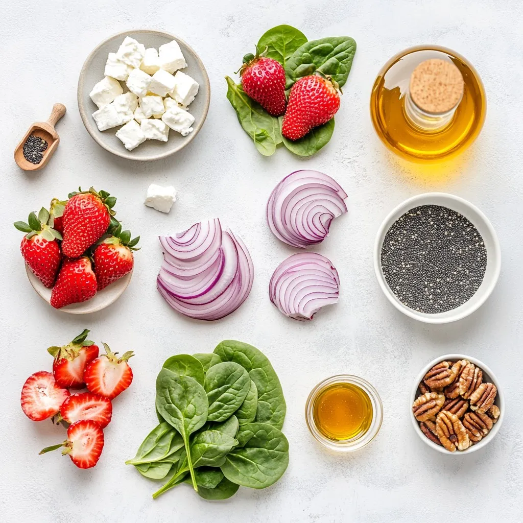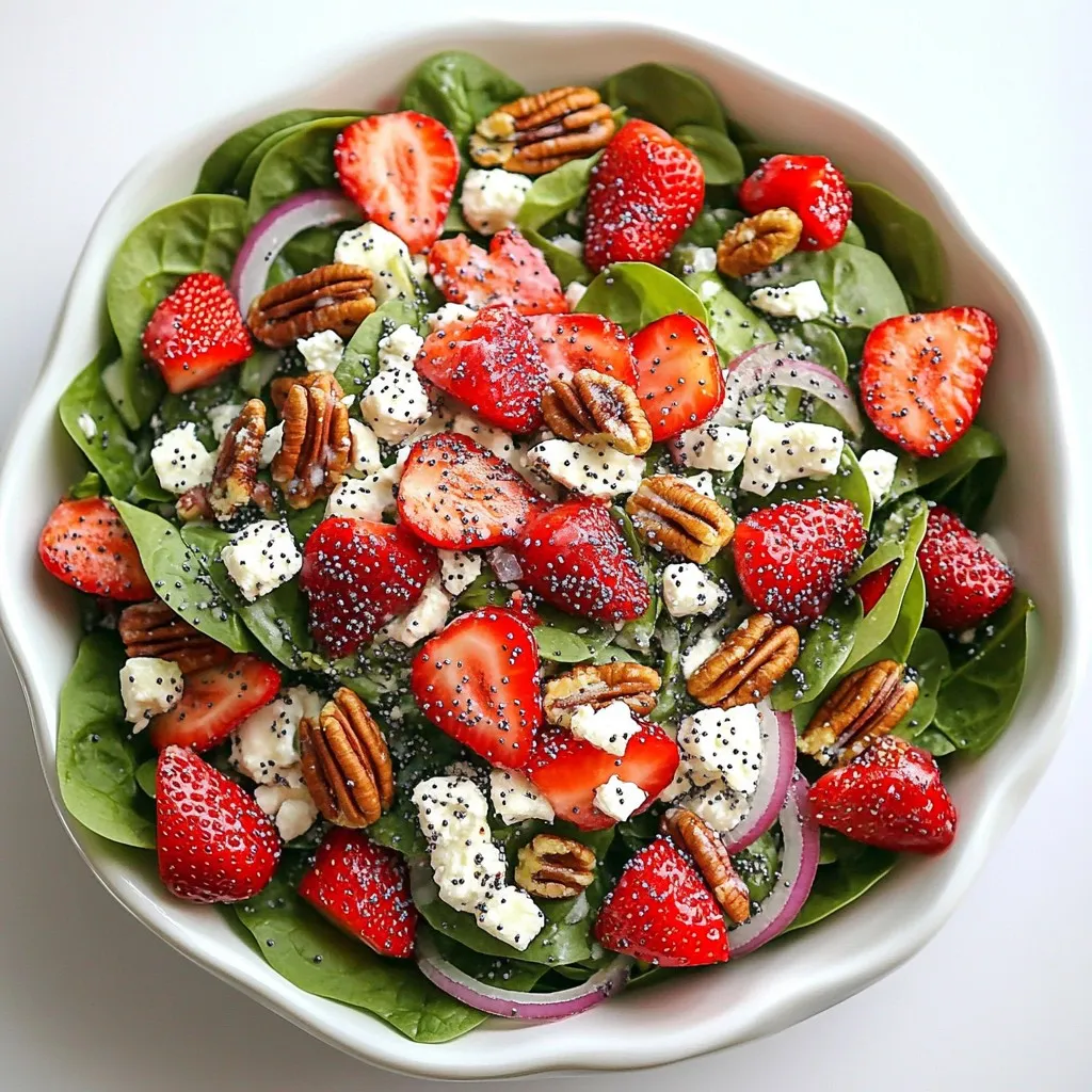 - 4 cups fresh spinach - 2 cups strawberries - 1/2 cup red onion - 1/4 cup feta cheese - 1/4 cup candied pecans - 1/4 cup poppy seeds - 1/3 cup olive oil - 1/4 cup apple cider vinegar - 2 tablespoons honey - Salt and pepper to taste When I create this salad, I focus on fresh, vibrant ingredients. Fresh spinach serves as the base. I use four cups, washed and dried. It adds a crisp texture and rich color. Next, I slice two cups of strawberries. Their sweetness brightens the dish. Strawberries also give a burst of flavor. Red onion adds a slight bite. I thinly slice half a cup to keep it mild. Now, let’s add some fun! I sprinkle in feta cheese. A quarter cup crumbled brings creaminess. Candied pecans add crunch and sweetness. I use a quarter cup for that extra pop. Lastly, I include a quarter cup of poppy seeds. They add a nice visual touch and a bit of nuttiness. For the dressing, I whisk together one-third cup of olive oil and a quarter cup of apple cider vinegar. To sweeten it, I add two tablespoons of honey. Salt and pepper bring everything together. This dressing makes the flavors sing! {{ingredient_image_1}} To make the dressing, start by taking a small bowl. Add the olive oil, apple cider vinegar, honey, and poppy seeds. Whisk these ingredients together until they blend well. This should take about 30 seconds. After mixing, taste the dressing. Add salt and pepper to your liking. You want it to be zesty but not overpowering. Set the dressing aside while you prepare the salad. Grab a large salad bowl and add the fresh spinach. Next, toss in the sliced strawberries and the thinly sliced red onion. These ingredients add color and crunch. Drizzle half of the poppy seed dressing over the salad. Gently toss the salad so that all the greens and fruits are coated. This helps every bite burst with flavor. Now, it’s time to add the finishing touches! Sprinkle the crumbled feta cheese over the top. Then, add the candied pecans for a sweet crunch. Give the salad a light toss again to mix everything. Taste it one more time. If you think it needs more dressing or seasoning, feel free to adjust. Serve this fresh and tasty salad right away. Enjoy every bite! To make your Strawberry Spinach Poppy Seed Salad shine, consider these ideas: - Garnish: Add extra strawberry slices on top. Sprinkle more poppy seeds for color. - Serving Dishes: Use a large, clear bowl. Individual plates also look nice and can impress guests. If you have leftover dressing, store it in a jar. Keep it in the fridge for up to a week. To save time, make the dressing ahead of time. Just whisk the ingredients and store. Shake well before using it again. You can swap out nuts or cheese in this salad easily. Try sunflower seeds or walnuts instead of pecans. For cheese, goat cheese works well too. If you want a different flavor for the dressing, use balsamic vinegar instead of apple cider vinegar. This change adds a rich twist to the taste. Pro Tips Fresh Ingredients: Always use fresh spinach and ripe strawberries for the best flavor and texture. Dressing Balance: Adjust the sweetness and acidity of the dressing by adding more honey or vinegar to suit your taste. Make-Ahead Tips: Prepare the dressing and chop the vegetables ahead of time, but combine them just before serving to keep the salad crisp. Garnish for Flair: Add a few whole strawberries on top and a sprinkle of poppy seeds for an eye-catching presentation. {{image_2}} You can easily boost the protein in your Strawberry Spinach Poppy Seed Salad. Grilled chicken or shrimp work great in this dish. They add flavor and make the salad more filling. Just slice them up and toss them in. For a vegetarian option, try adding chickpeas. They are healthy and add a nice texture. Simply drain and rinse them before mixing them in. Feel free to get creative with seasonal fruits. You can swap out strawberries for other berries like blueberries or raspberries. Peaches or mangoes also work well in summer. This lets you adapt the salad based on what you have. Use the freshest fruits for the best taste. If you need gluten-free options, this salad is already a winner. All the main ingredients are gluten-free. For a nut-free alternative, skip the candied pecans. You can add sunflower seeds for crunch instead. This keeps the salad tasty while catering to different diets. To keep your Strawberry Spinach Poppy Seed Salad fresh, store it in an airtight container. This method helps prevent wilting and keeps flavors bright. If you have leftovers, the salad will stay good for about one day in the fridge. The fresh spinach and strawberries break down quickly, losing their crispness. You can keep the dressing separate to help maintain quality. Can the salad be frozen? No, I do not recommend freezing this salad. Freezing can change the texture of the spinach and strawberries. However, you can freeze the dressing! To do this, pour the dressing into ice cube trays. Once frozen, transfer the cubes to a bag. This way, you can easily use the dressing later. To refresh the salad before serving, gently toss it with some fresh spinach and a bit of dressing. This adds a nice crunch and flavor. Do not heat the salad; it is best served cold. If you want to maintain quality, avoid adding feta cheese or nuts until right before serving. To make the salad vegan, simply swap out the feta cheese. You can use a plant-based cheese or leave it out entirely. You can also replace honey with maple syrup or agave nectar. This keeps the sweetness and makes it vegan-friendly. Yes, you can prepare the salad in advance. However, I recommend storing the dressing separately. This helps keep the salad fresh. The salad will stay fresh for about one day in the fridge. To enjoy, just add the dressing just before serving. The poppy seed dressing is a great match for this salad. It adds a nice sweetness and tang. If you want to try something different, consider balsamic vinaigrette or a lemon olive oil dressing. These options will still tast