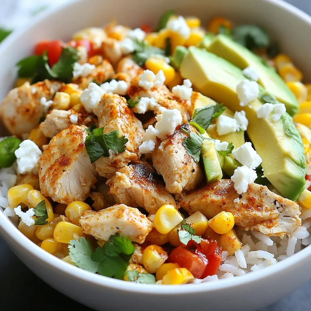 This dish combines juicy chicken, sweet corn, and fresh veggies. The spices add a warm kick. Each topping brings a new flavor. This makes every bite a delight. You can mix and match ingredients based on what you have. The avocado adds creaminess, while feta gives a salty touch. Each ingredient works together to create a vibrant meal.