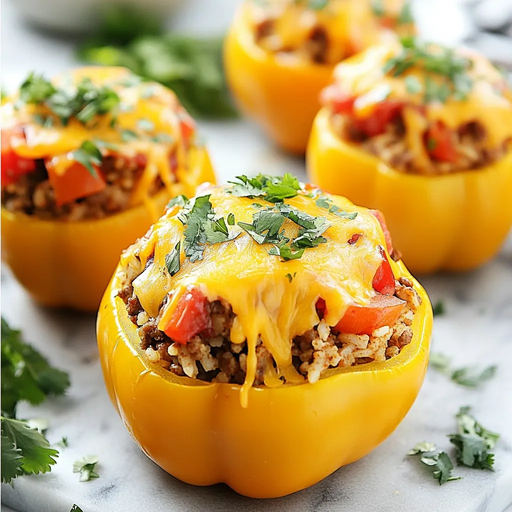 Delicious stuffed bell peppers filled with ground beef, rice, and spices, topped with melted cheese.