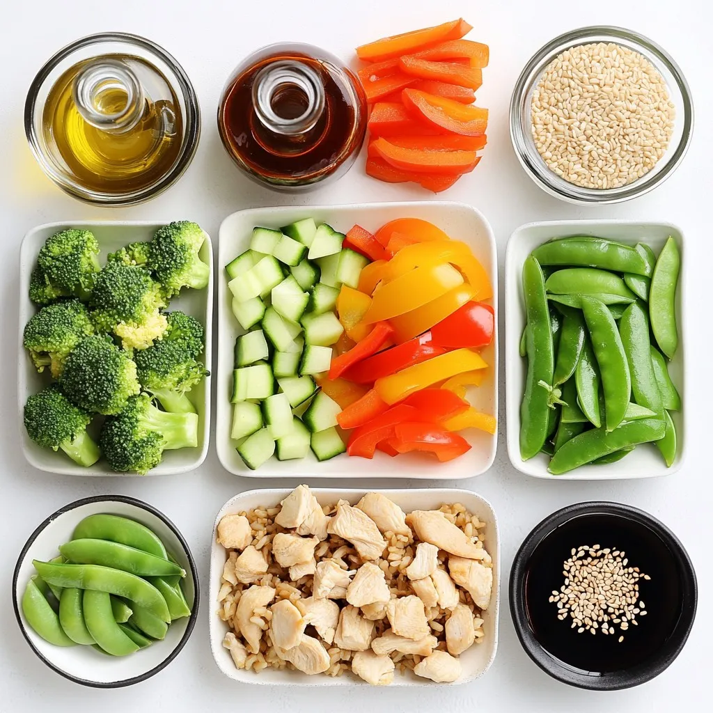 These ingredients come together to create a tasty and healthy meal. Brown rice provides a great base. Chicken thighs add protein and flavor. Fresh vegetables bring color and crunch. Teriyaki sauce gives it that sweet and savory kick. Olive oil and sesame oil add depth and richness to the dish.