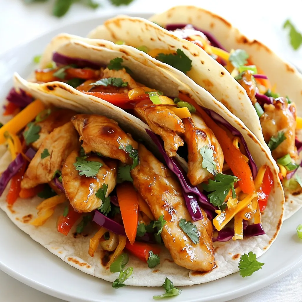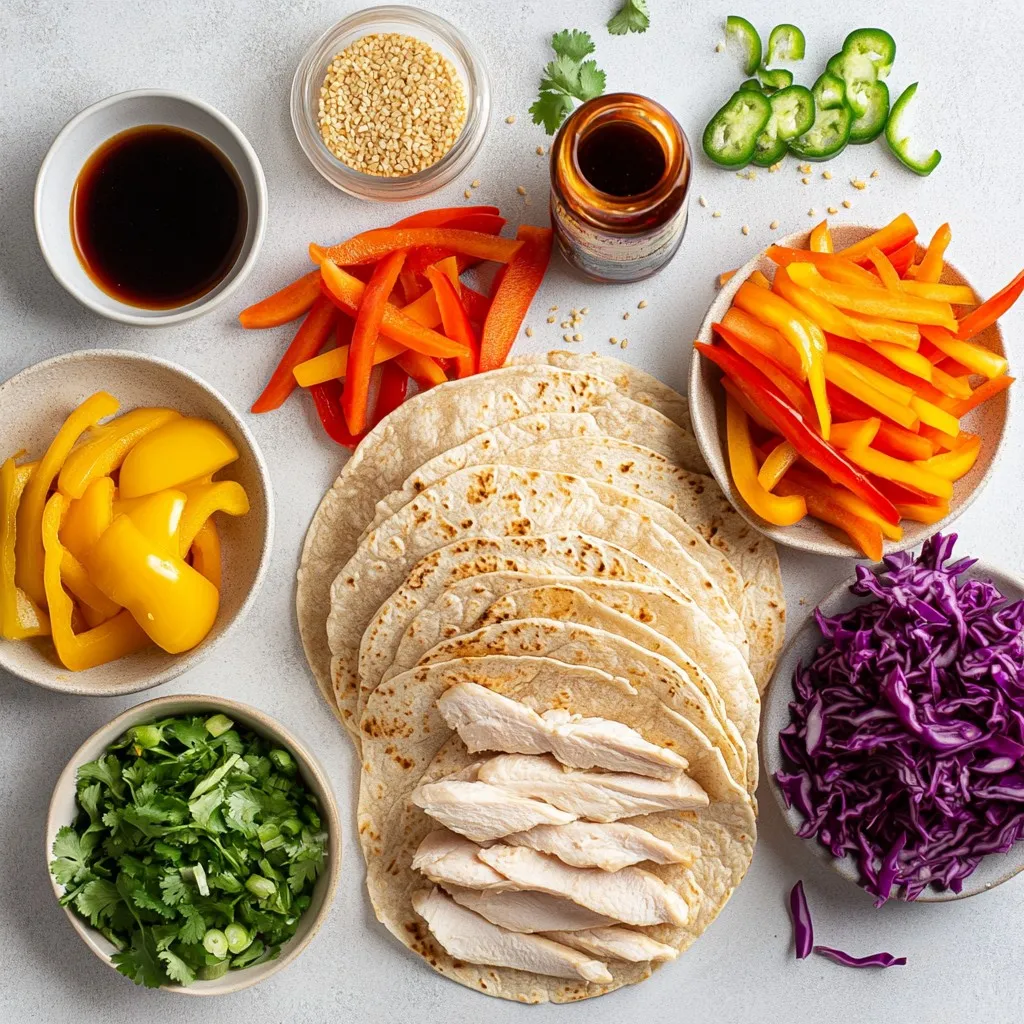 Lay out your large whole wheat tortillas on a clean surface. Start by placing the chicken strips in the middle of each tortilla. Next, add the stir-fried vegetables, shredded red cabbage, chopped cilantro, and green onions. If you enjoy some heat, drizzle Sriracha or sprinkle chili flakes on top.