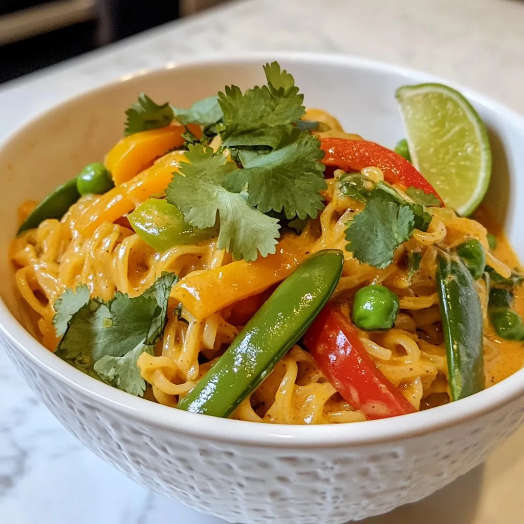 A delicious and creamy noodle dish infused with Thai flavors, featuring coconut milk and vibrant vegetables.