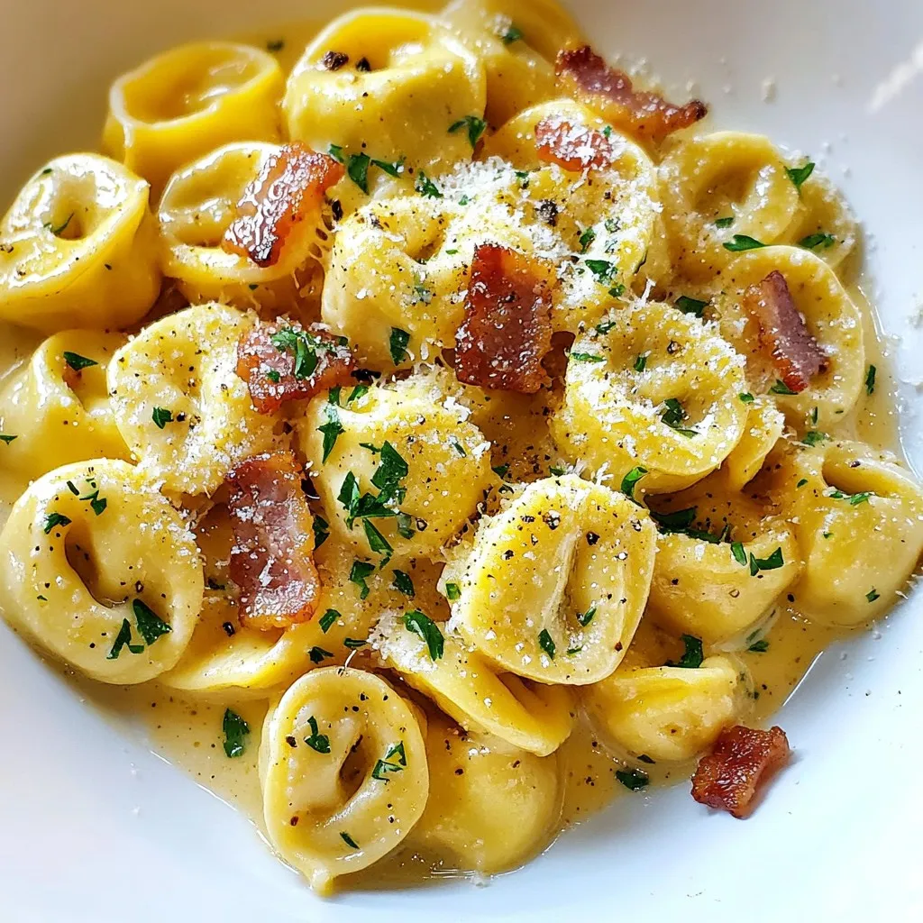 A creamy and delicious pasta dish featuring cheese tortellini, turkey bacon, and a rich egg and Parmesan sauce.
