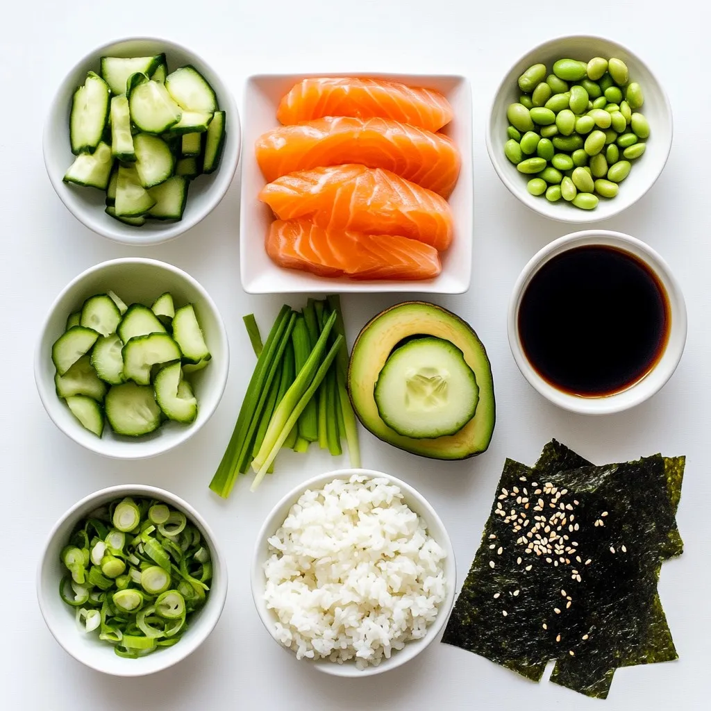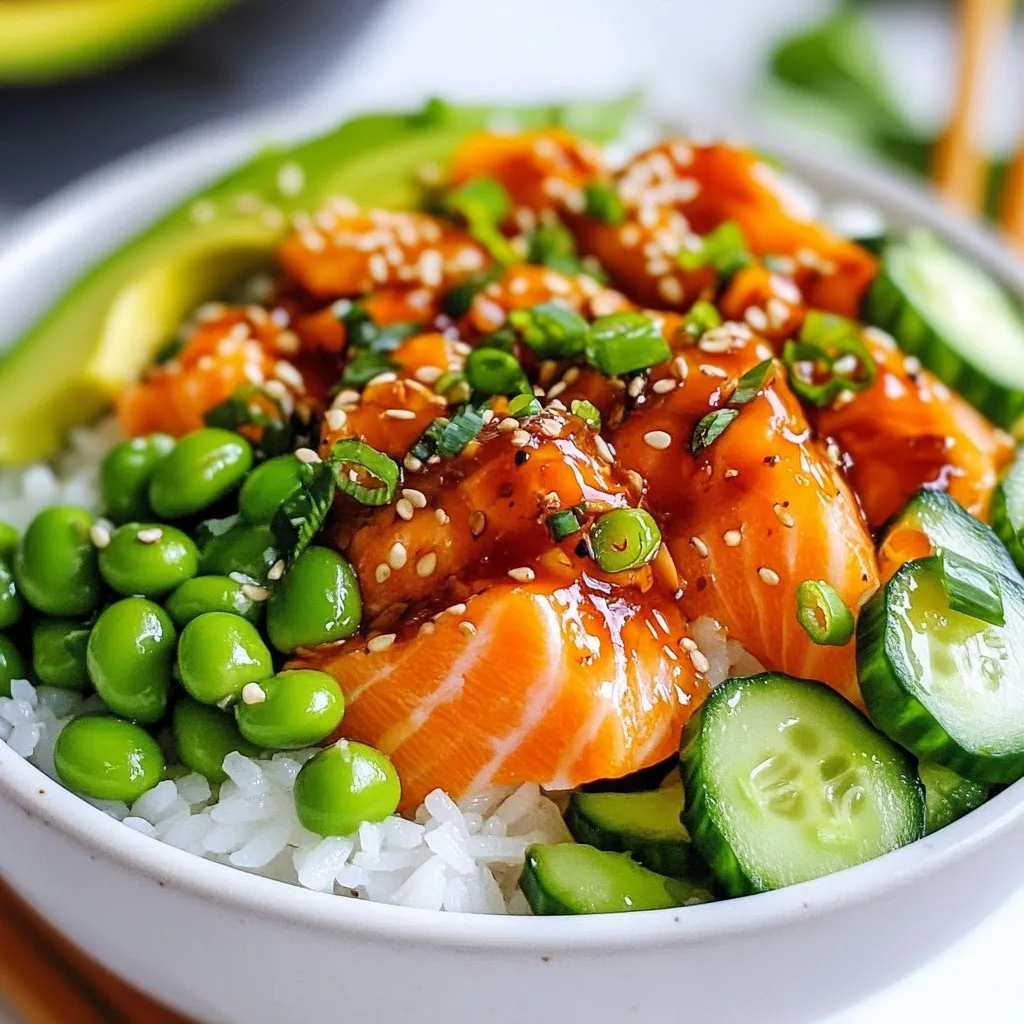 A well-presented dish makes any meal special. Start with a base of fluffy sushi rice in each bowl. Arrange the salmon slices on top. Add avocado and cucumber slices for color and crunch. Sprinkle with green onions and sesame seeds. Finally, place seaweed strips on the side. This adds texture and taste. Serve with spicy mayo on top for a tasty kick!