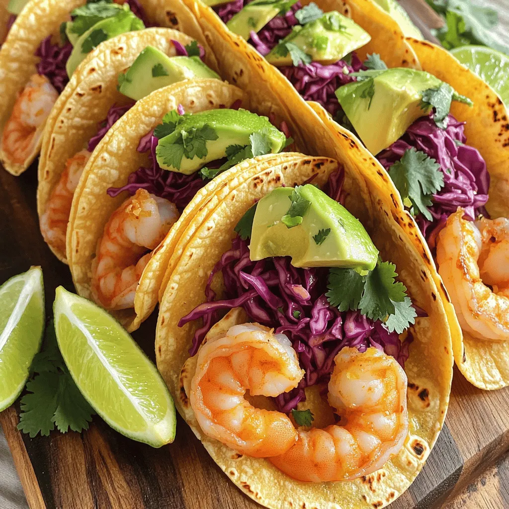 For this recipe, fresh shrimp give the best taste. The lime zest adds a bright kick. Olive oil helps to keep the shrimp tender. Garlic brings depth to the flavor. Smoked paprika adds a nice touch, while cumin rounds it out. Use corn tortillas for a classic taco base. Red cabbage adds crunch, and avocado brings creaminess. Cilantro and lime wedges finish your dish with freshness.